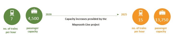 DART+ West is seeking to significantly increase rail capacity on the Maynooth Line. This can be achieved by changing to electrified, high capacity DART trains and increasing the frequency of trains subject to demand.