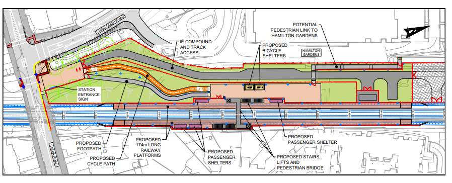 There will be a station entrance plaza area next to the railway line which gives access to the northbound platform. This area will be adjacent to the Hamilton Gardens development and will have ticket vending machines and active travel facilities including bicycle parking facilities and will provide a safe public realm environment. Lighting and CCTV coverage will be provided for this area.