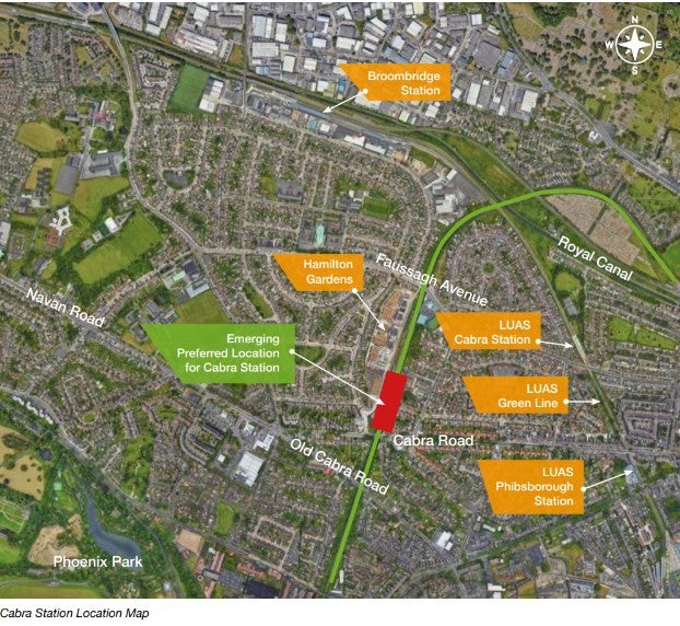 The preferred option for the location for the new Cabra station is off Cabra Road, to the north of Cabra Road bridge and adjacent to the new Hamilton Gardens residential development. The proposed station access utilises an existing Iarnród Éireann access point off Cabra Road.