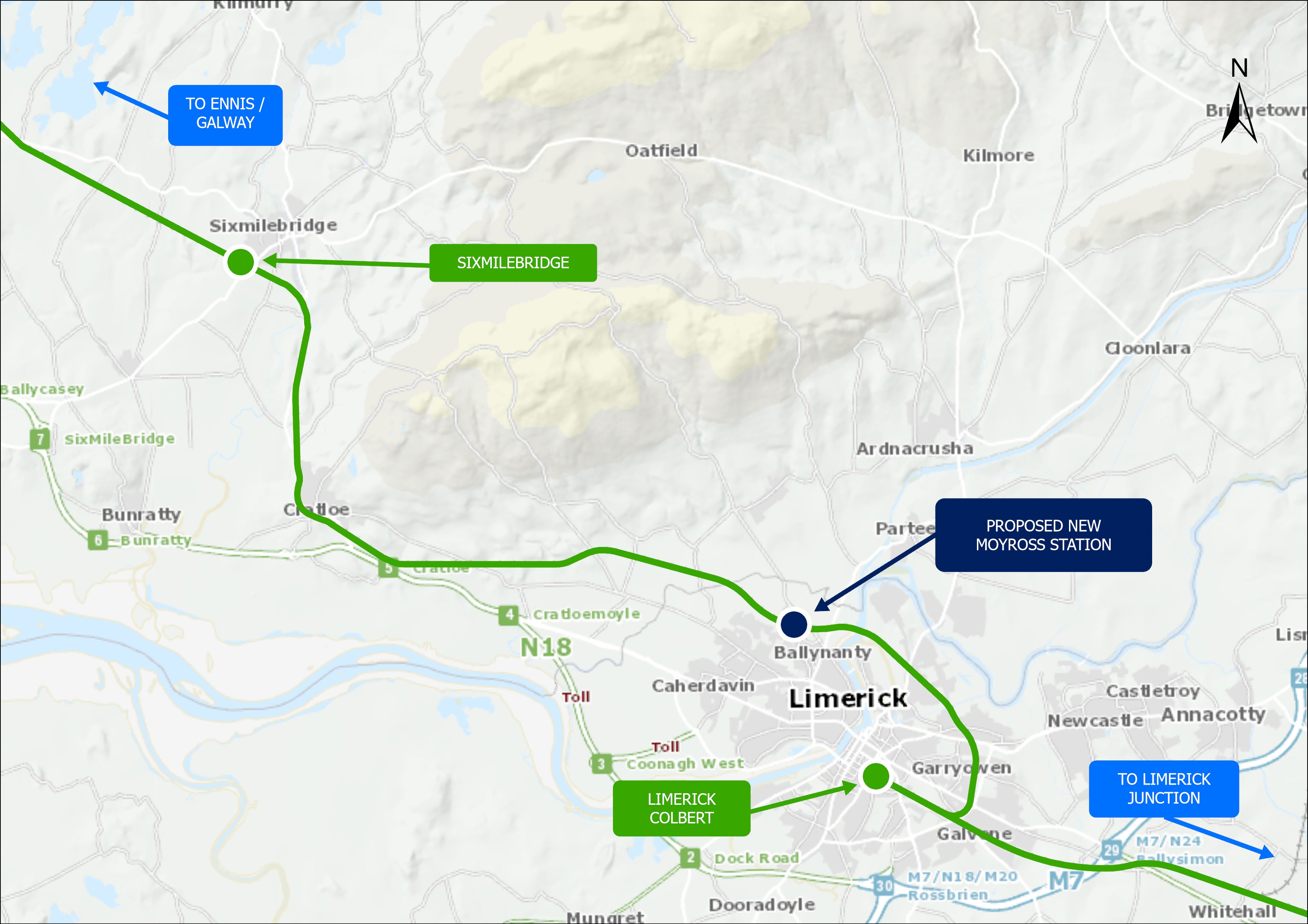 Iarnród Éireann plan to construct a new rail station in the Moyross area of Limerick, on the existing Limerick to Galway line. The new Moyross station will provide improved public transport links for the growing population in this area, with connectivity to Limerick city centre, Galway, Cork, Dublin and beyond.