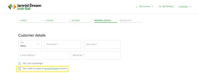 - Step 6 - Passenger Details - Enter name(s). If you don't have an account, don't worry, you can register for an online account by simply ticking 'Yes, I wish to create an Iarnród Éireann account' under 'Customer details'. If you dont want to create an Iarnród Éireann continue as a guest. Once your booking is complete you will receive an email with your password, please ensure that you copy and paste the password from the email to avoid making a mistake typing in the password. You can update your password under 'My Account' if you wish