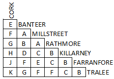 - Note the letter where your origin and destination stations intersect on the grid eg fare letter Cork to/from Killarney = H. Using that letter check the Tickets and Fares Chart (below) to view the tickets and fares available for that station combination