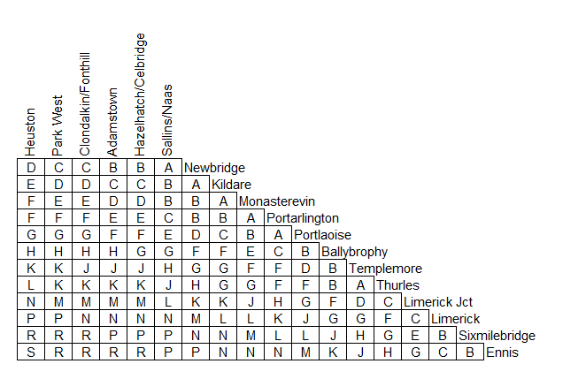 - Note the letter where your origin and destination stations intersect on the grid eg fare letter Cork to/from Portlaoise = N. Using that letter check the Tickets and Fares Chart (below) to view the tickets and fares available for that station combination