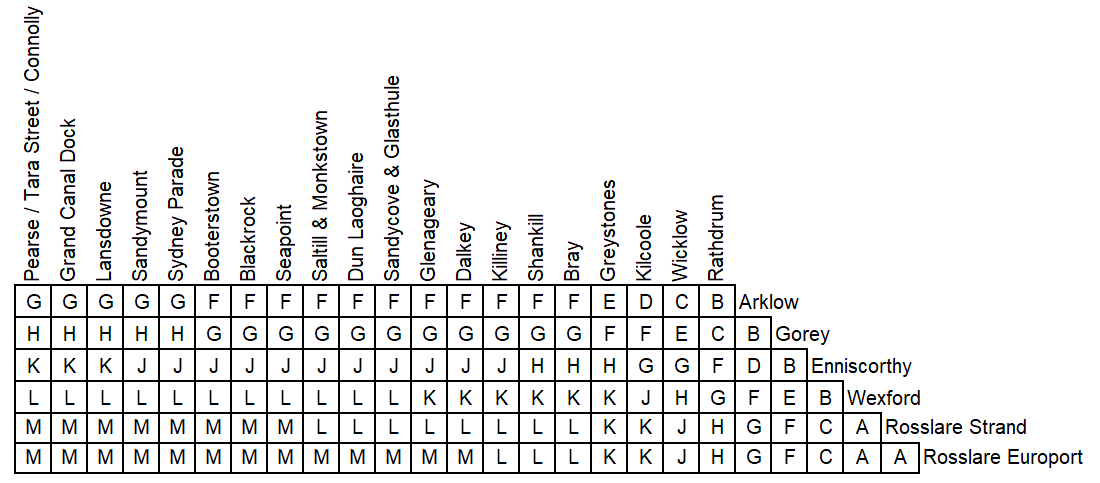 - Note the letter where your origin and destination stations intersect on the grid eg fare letter Wexford to/from Dublin Connolly = L.