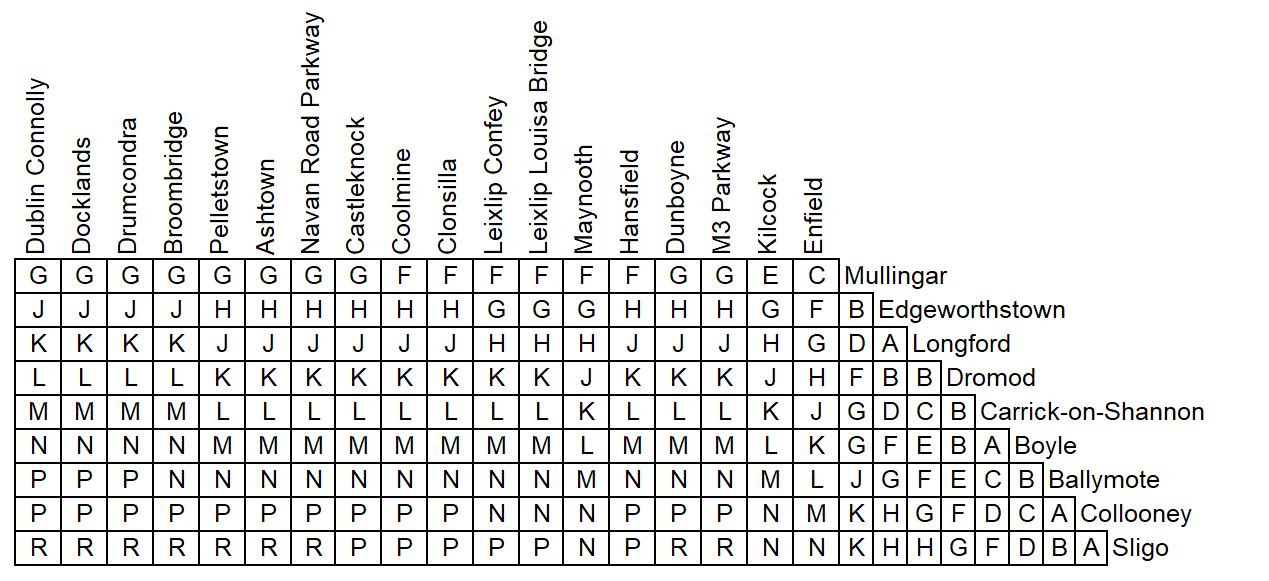 - Note the letter where your origin and destination stations intersect on the grid eg fare letter Sligo to/from Carrick-on-Shannon = F.