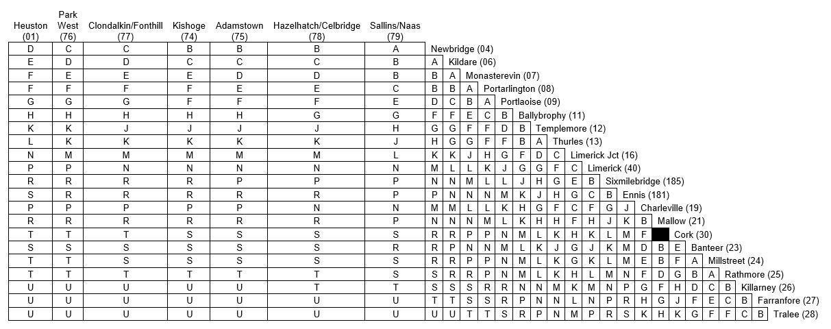 - Note the letter where your origin and destination stations intersect on the grid eg fare letter Tralee to/from Portlaoise = S. Using that letter check the Tickets and Fares Chart (below) to view the tickets and fares available for that station combination