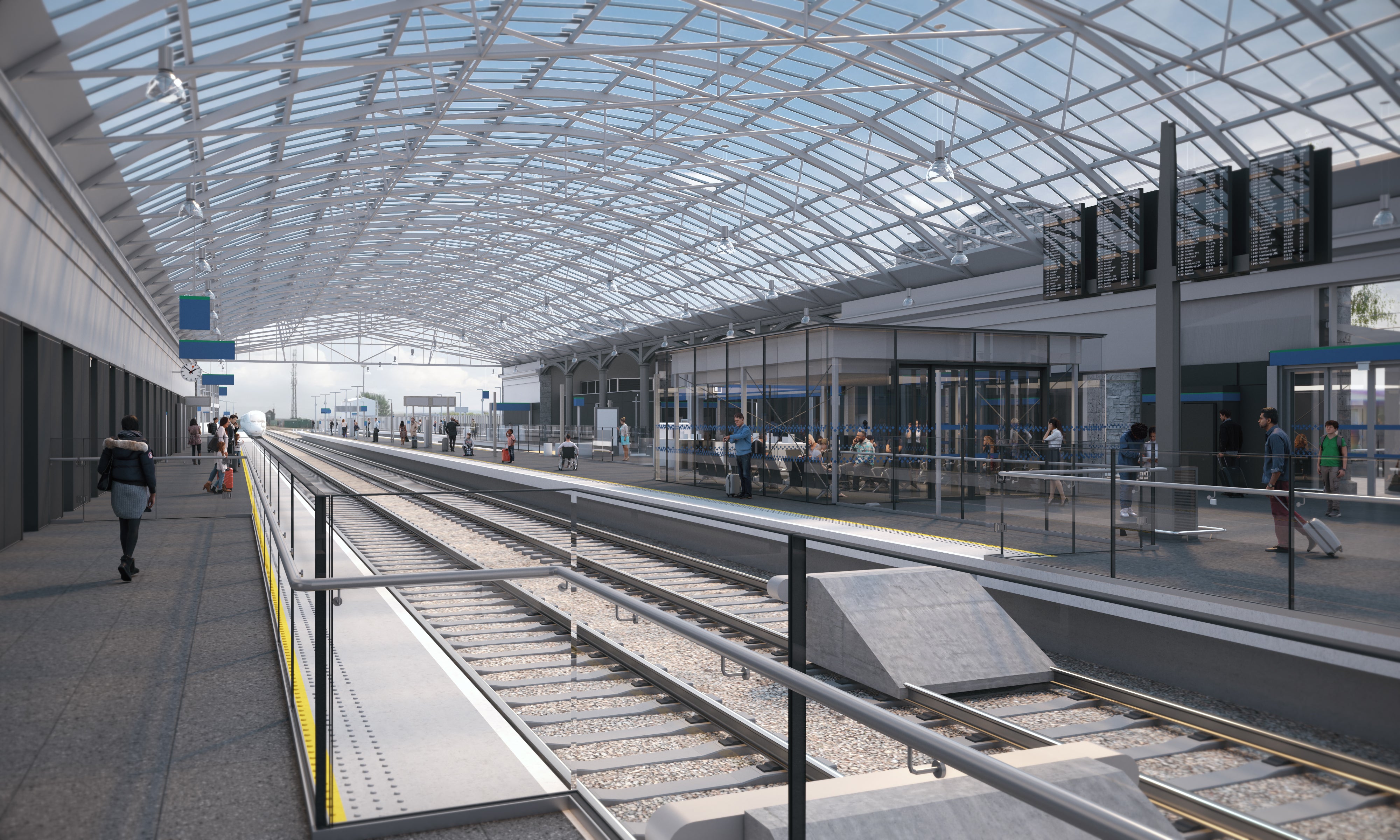- Cuirfear díon nua ar an halla traenach atá ann cheana féin chun an t-ardán agus na limistéir ghluaiseachta a athrú ina spásanna geala agus fáilteacha