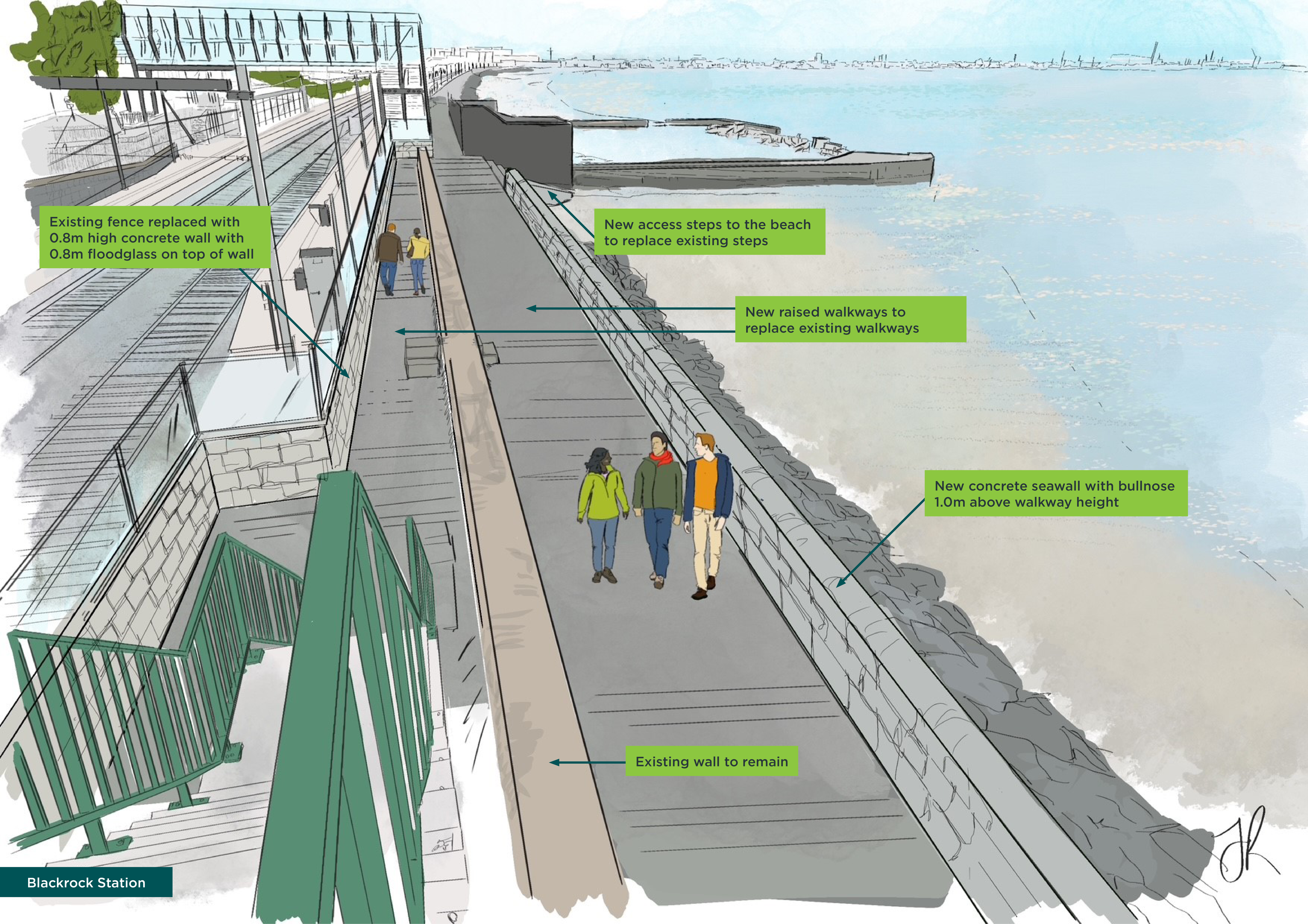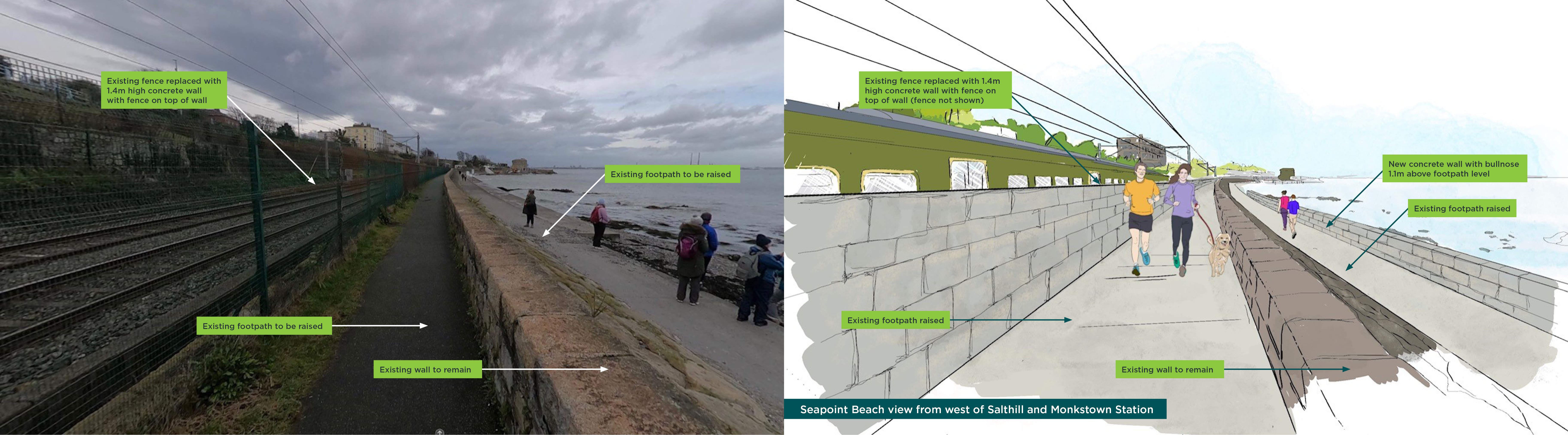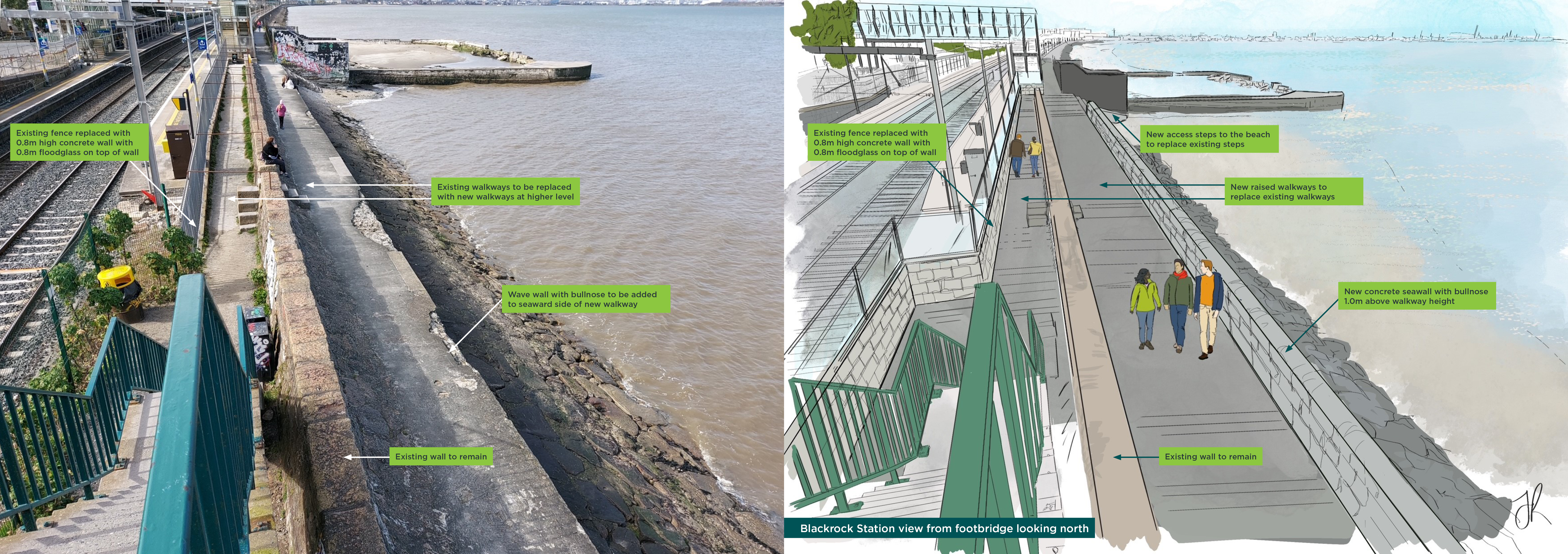 Tógfar ballaí nua taobh na talún agus taobh na farraige ón mballa atá ann cheana féin. Déanfar an siúlbhealach atá ann feadh thaobh na farraige den bhalla mara a ardú agus suiteálfar balla nua ar aghaidh thaobh na farraige den siúlbhealach ardaithe agus feabhsaithe chun cosaint ar scaileogú a chur ar fáil. Tógfar balla cúil feadh líne an fháil atá ann, agus é ardaithe a thuilleadh le gloine thuile feadh ardán an stáisiúin. Coinneofar rochtain phoiblí ar an gcladach.