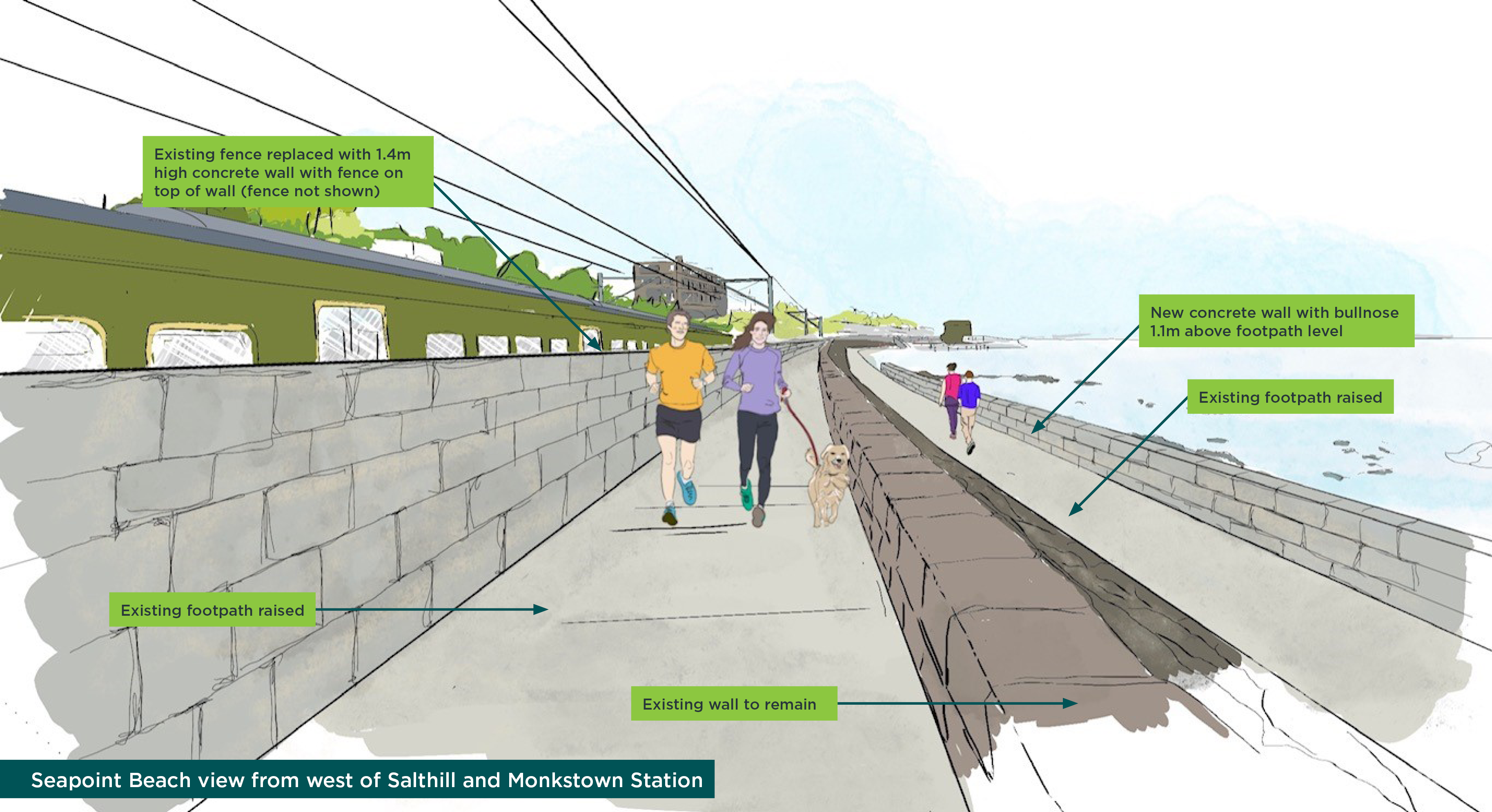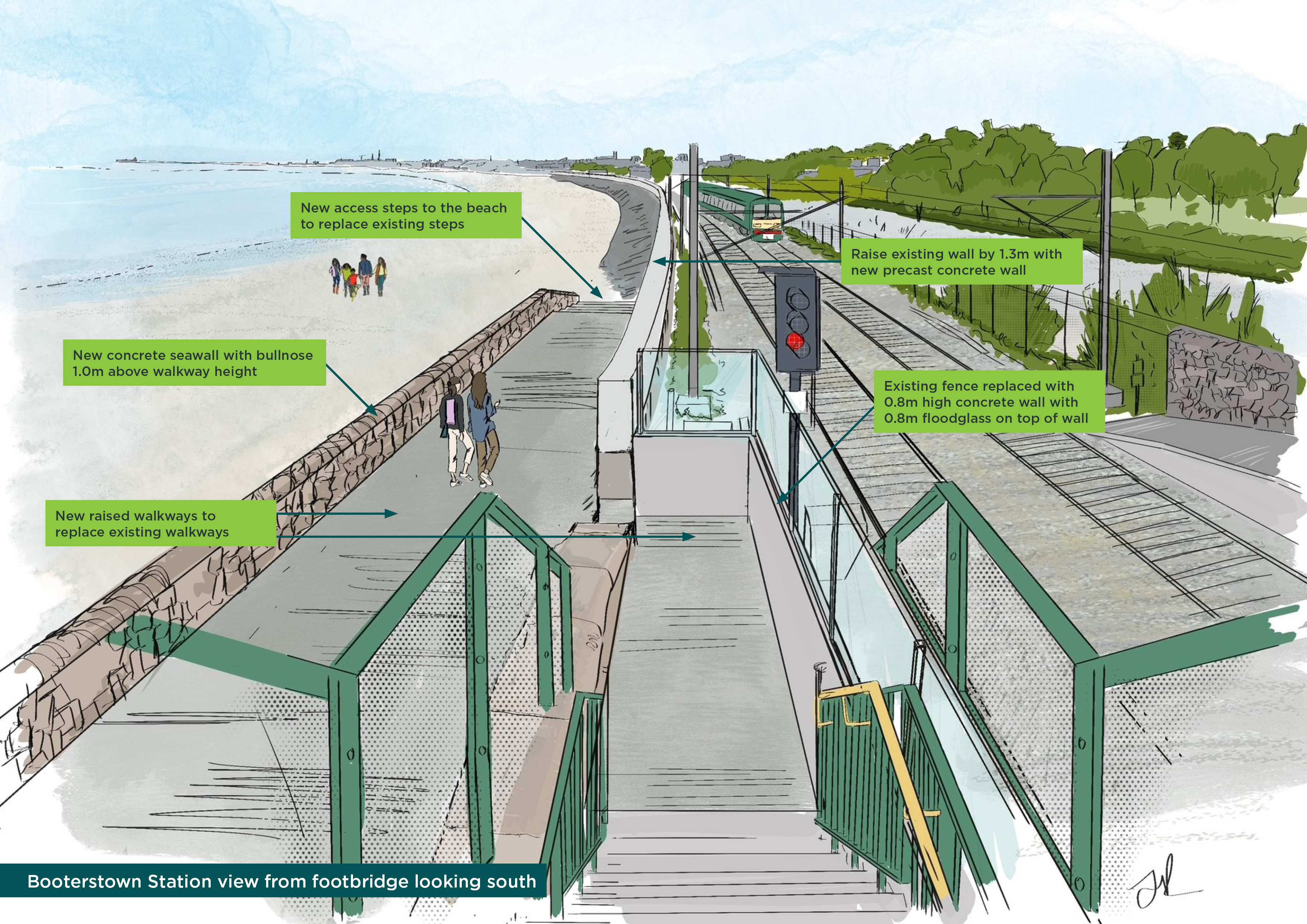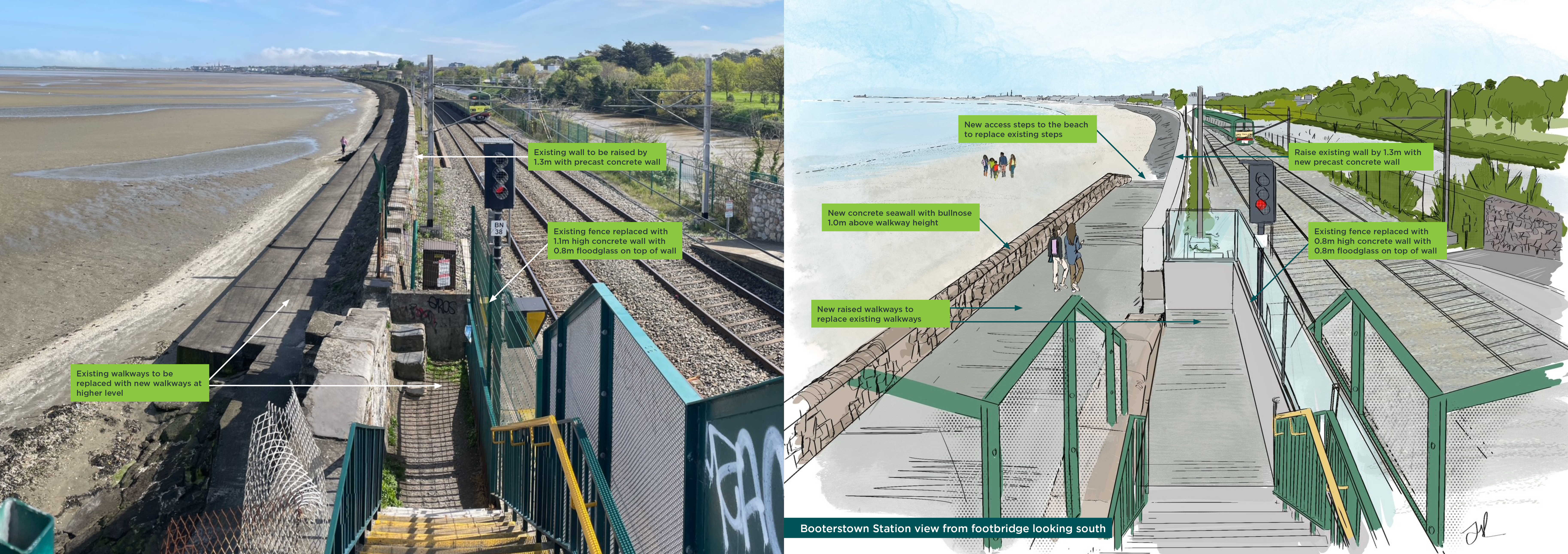 Tógfar ballaí nua taobh na talún agus taobh na farraige ón mballa atá ann cheana féin. Déanfar an siúlbhealach atá ann feadh thaobh na farraige den bhalla mara a ardú agus suiteálfar balla nua ar aghaidh thaobh na farraige den siúlbhealach ardaithe agus feabhsaithe chun cosaint ar scaileogú a chur ar fáil. Tógfar balla cúil feadh líne an fháil atá ann, agus é ardaithe a thuilleadh le gloine thuile feadh ardán an stáisiúin. Coinneofar rochtain phoiblí ar an gcladach.