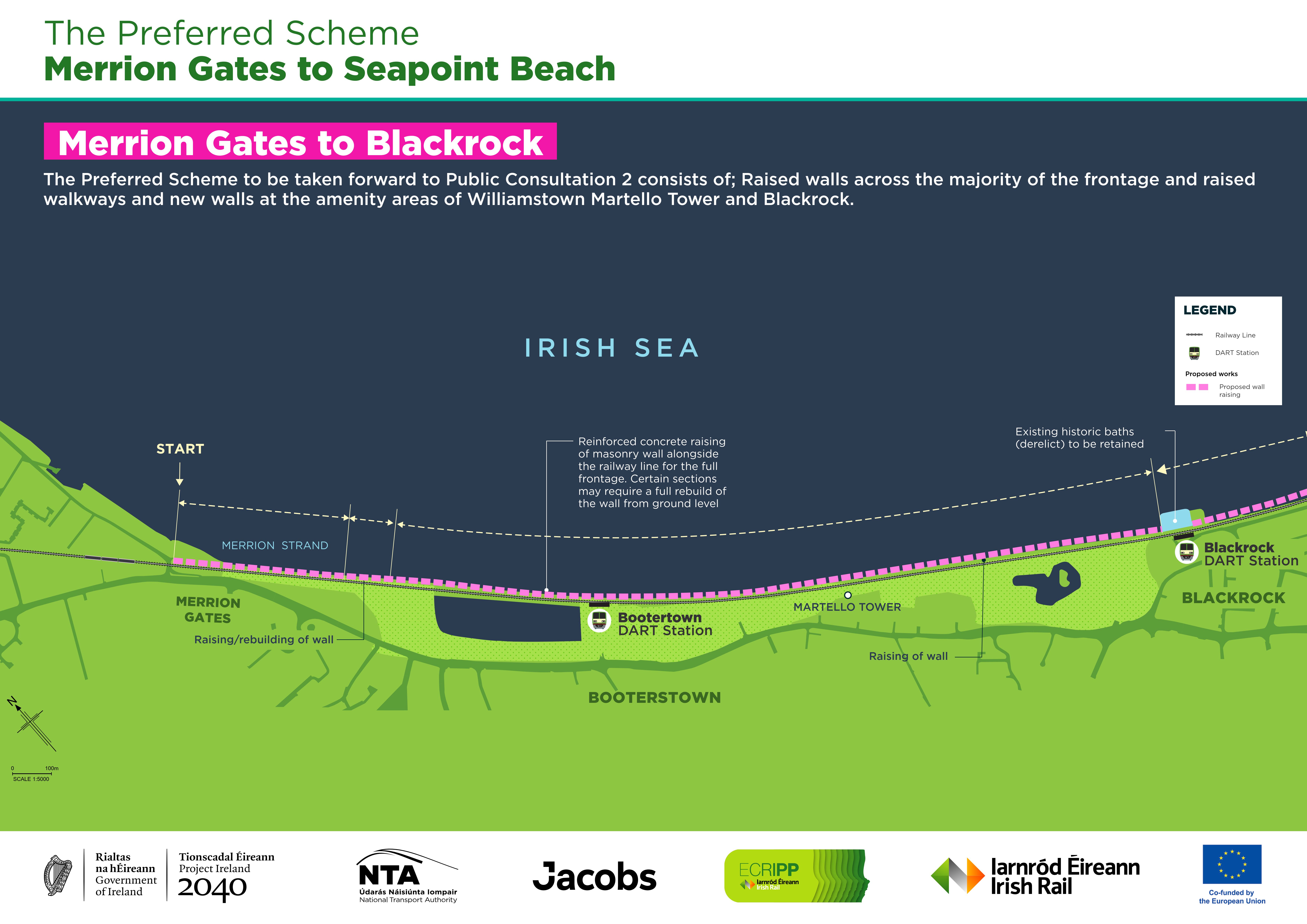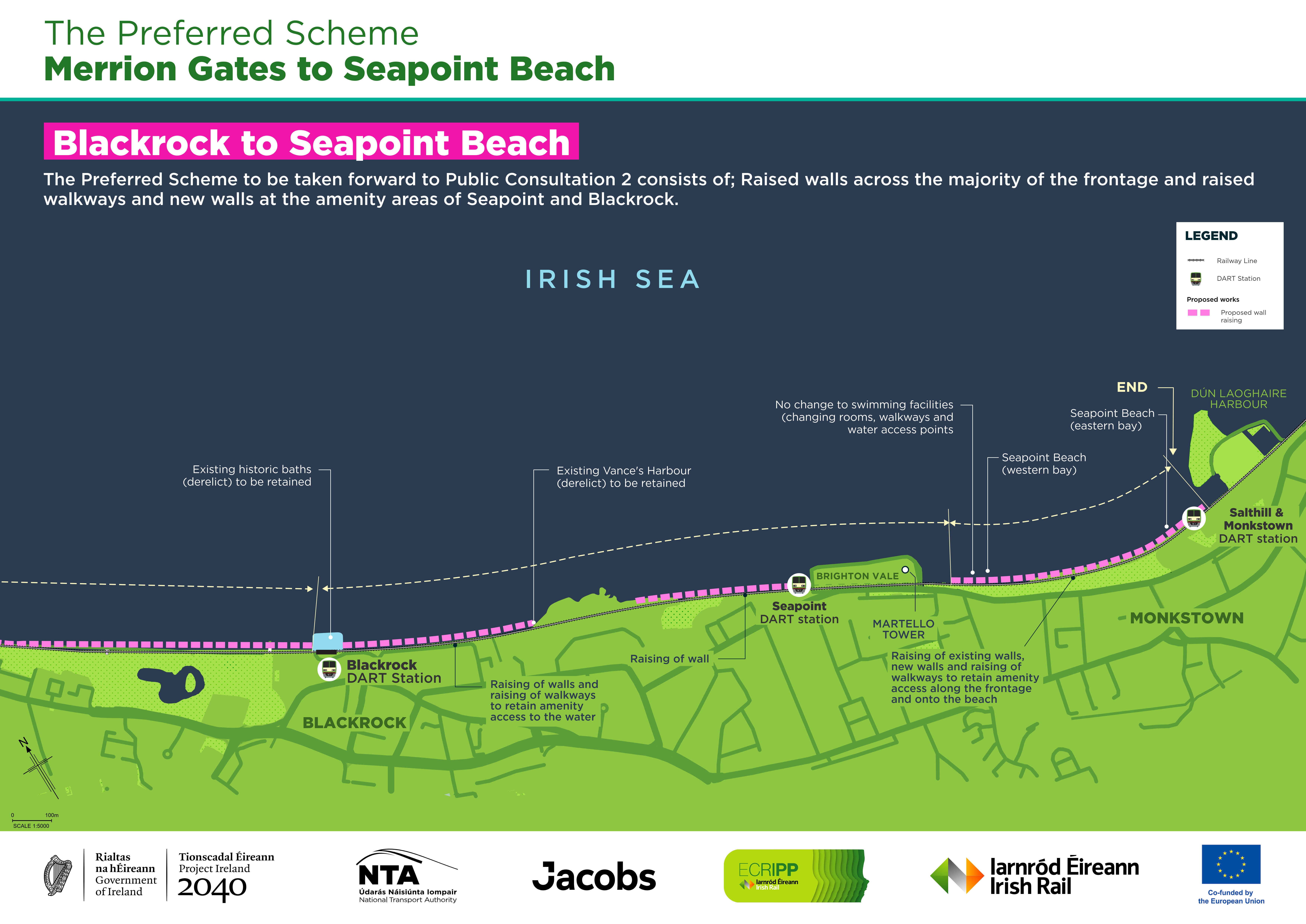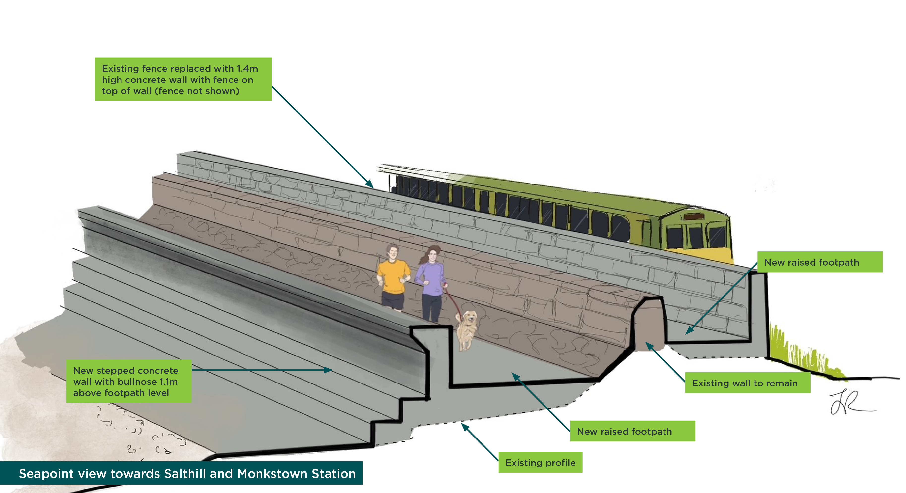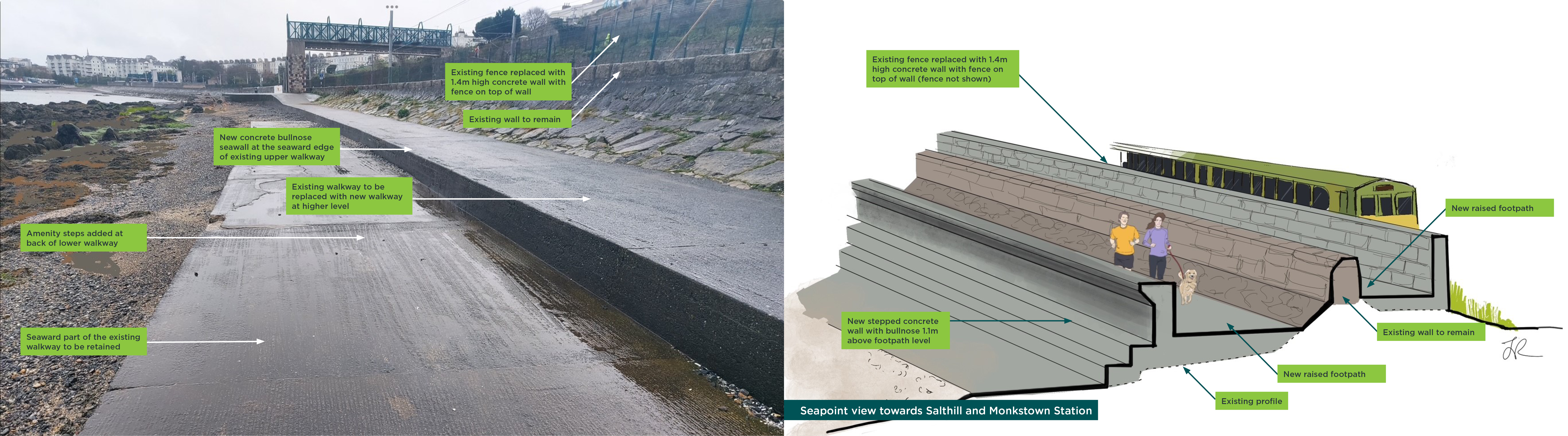 Tógfar balla coincréite nua taobh na farraige os cionn siúlbhealach ardaithe agus feabhsaithe os cionn an tsraodbhalla atá ann cheana féin. Cuirfear céimeanna taitneamhachta nua ar fáil taobh na farraige. Cuirfear balla coincréite 1.3m ar airde in ionad an fháil atá ann cheana feadh an iarnróid. Ní dhéanfar oibreacha ar bith ar an mballa atá ann ach ardófar an cosán idir an balla atá ann agus an balla cúil nua.
