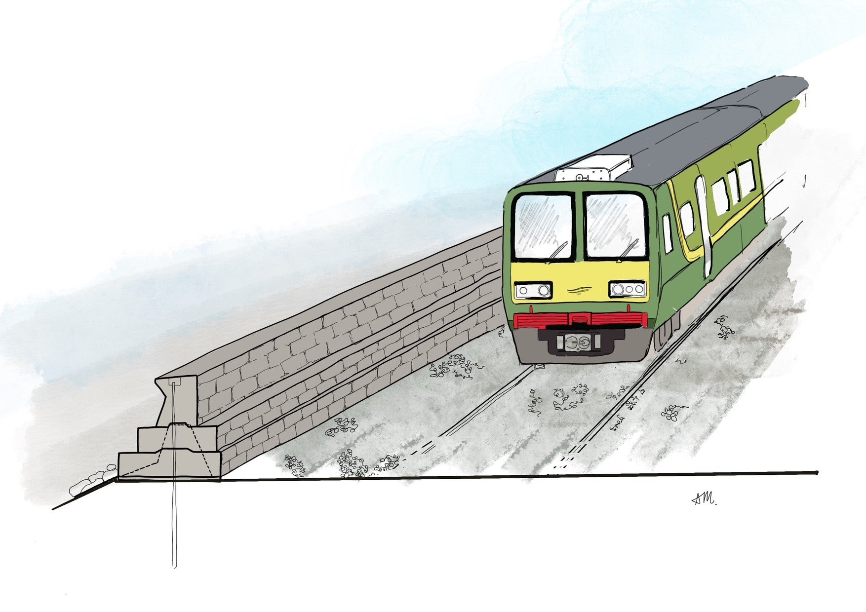 An balla mara atá ann a ardú agus balla cúil nua a thógáil feadh líne fhál an iarnróid. Déanfar an limistéar idir an dá bhalla a ardú chun limistéar taitneamhachta feabhsaithe a chur ar fáil.