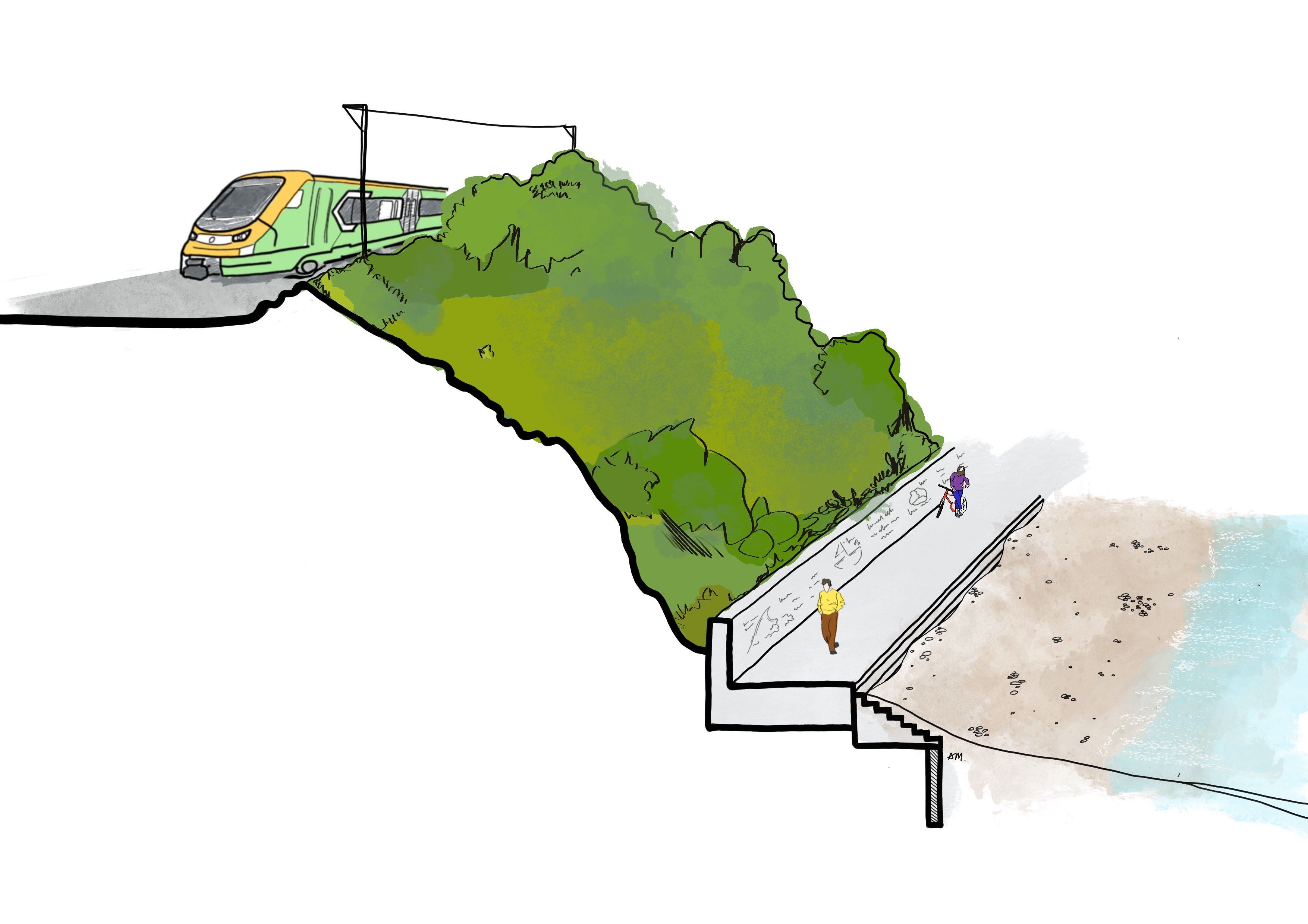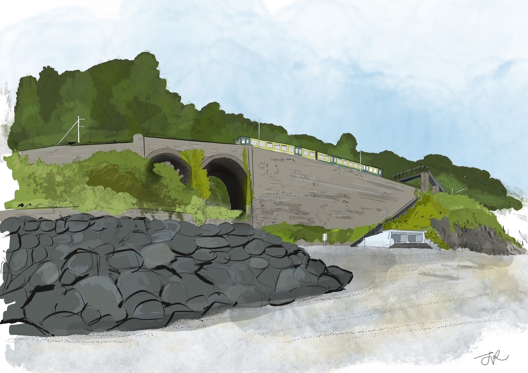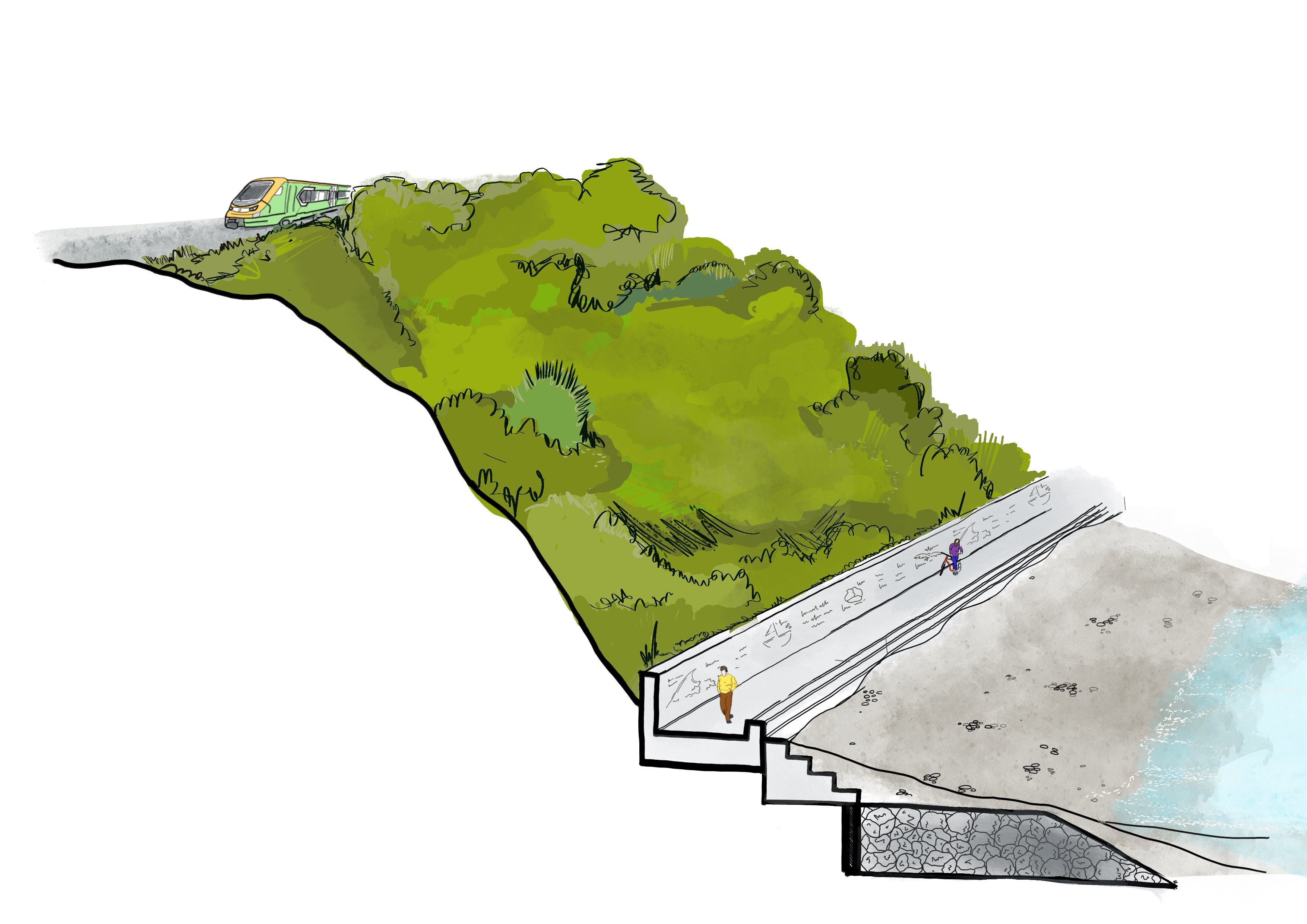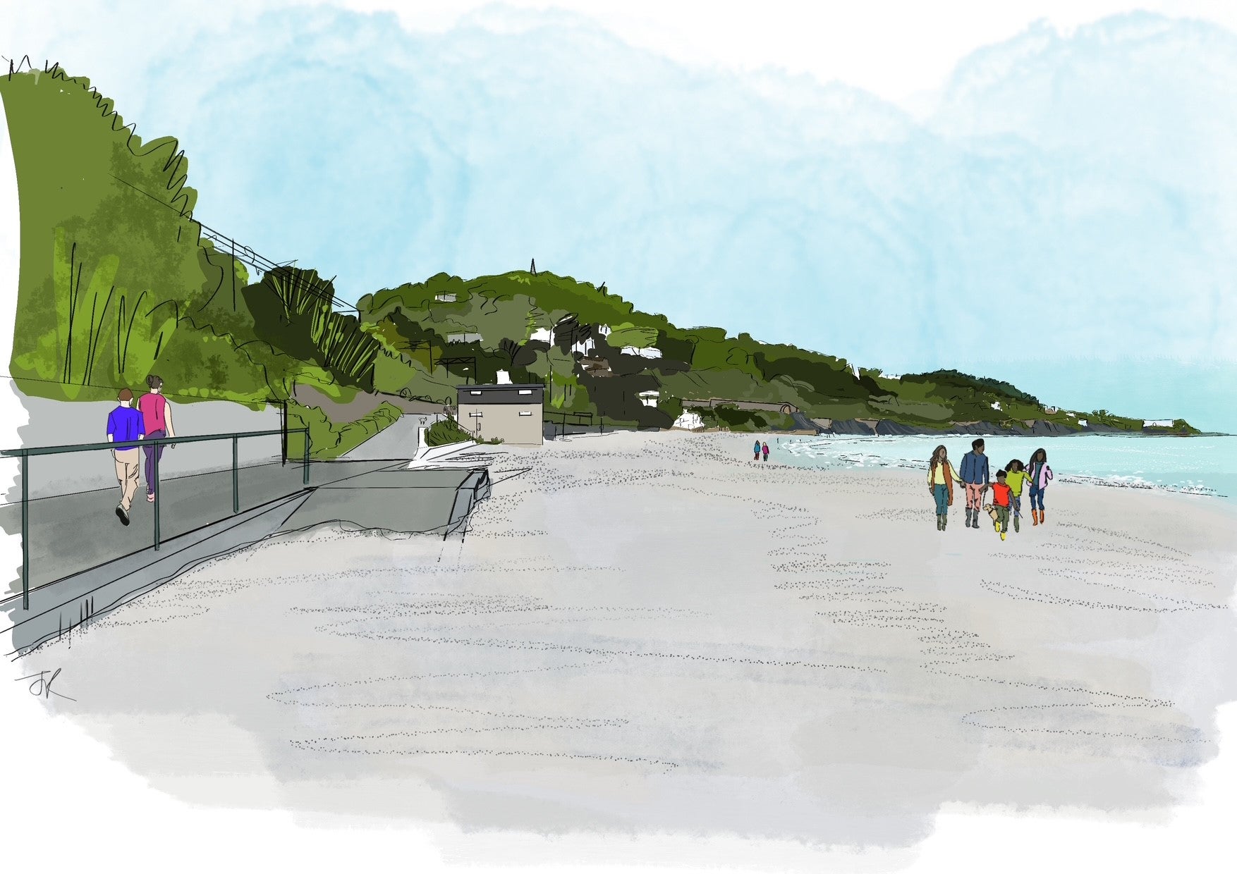 - Illustrative view of the raised walkway and seawall at Killiney Beach