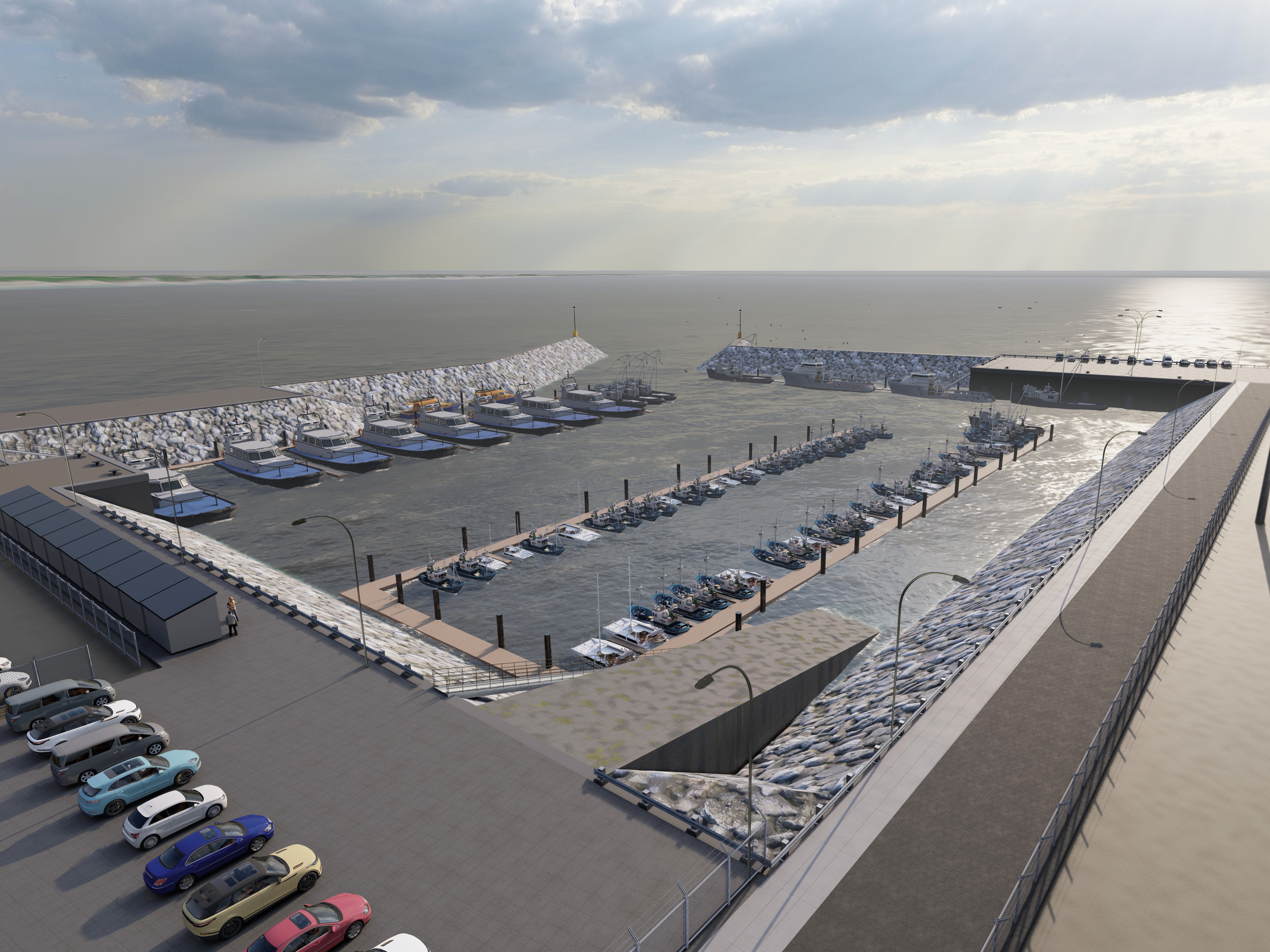 - Bóthar rochtana nua agus cosán/rothar-raon chuig an gcuan bád beag nua;