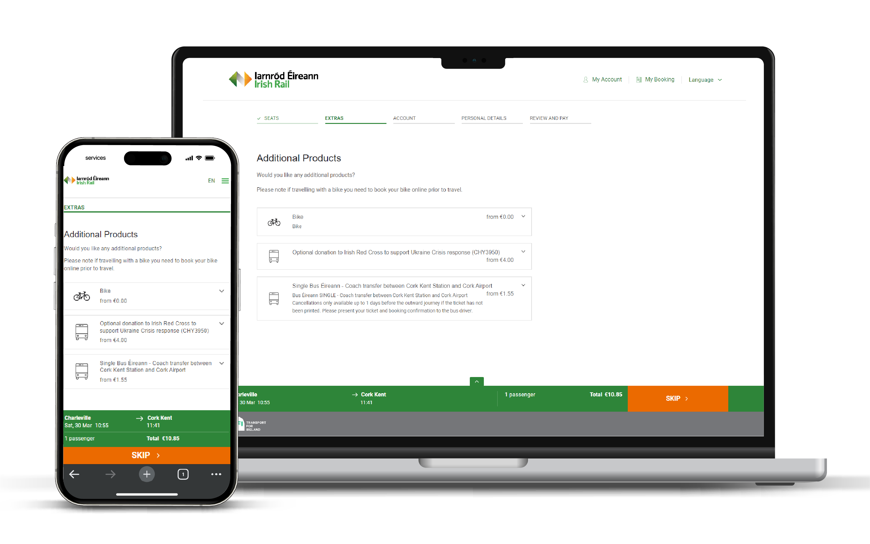 Is féidir le custaiméirí atá ag déanamh áirithinte ar líne chun taisteal go Stáisiún Cheannt, Corcaigh aistriú Bus Éireann a chur le d’áirithint ar €1.55, rud a chinntíonn turas réidh go hAerfort Chorcaí.