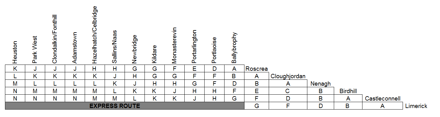 - Tabhair faoi deara an litir ina dtrasnaíonn do stáisiúin imeachta agus cheann scríbe ar an eangach, e.g. litir tháille an tAonach chuig/ó Stáisiún Heuston, Baile Átha Cliath = M. Trí úsáid a bhaint as an litir sin, seiceáil Cairt na dTicéad agus na dTáillí (thíos) chun na ticéid agus na táillí a fheiceáil atá ar fáil don mheascán stáisiún sin